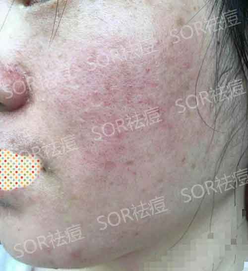 一开始她也是比较谨慎的,就用一些所谓的偏方,什么水果啦、蔬菜啦来敷脸,不过没有什么效果。后来又用祛痘产品,又在其他人的推荐下用了一些药膏,甚至还刷酸刷了半个月。这样一番操作下来,原本只是长痘的脸开始慢慢变得敏感起来,还经常有脱皮的现象。这让她苦恼不已,看着自己的脸越来越严重,压力也越来越大。而且因为脸上情况越来越糟糕,她不得不每天带着口罩出行,生怕别人投来异样的眼光。